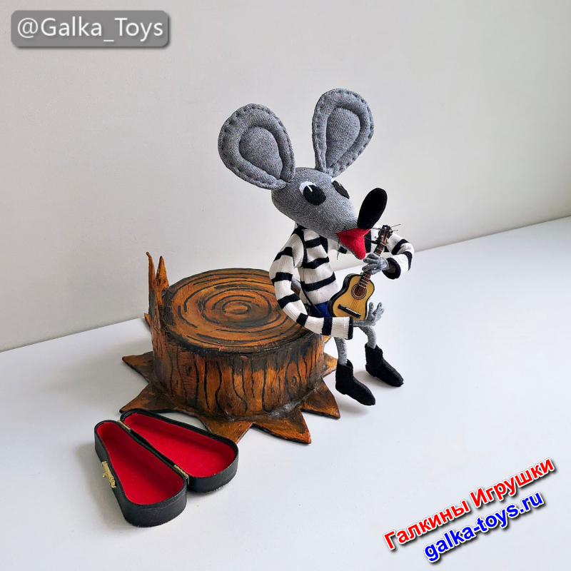 Материалы: трикотажное полотно, проволока, холлофайбер, флис, папье-маше, картон, акриловые краски, акриловый лак, миниатюрная гитара из дерева, футляр для гитары Размер: Пенек: Диаметр 13 см Высота 5 см Мышонок 25 см